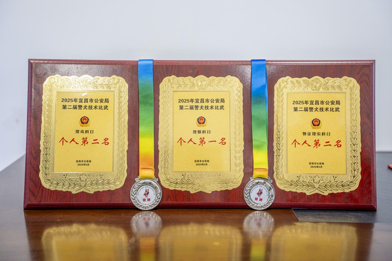 在2025年宜昌市第二届警犬技术大比武中,团队凭借扎实的日常训练、精湛的临场指挥和警犬稳定的实战发挥,在全市各参赛队伍中脱颖而出,荣获全市“综合团体”第一名,“搜爆科目”个人第一名,“搜毒科目”个人第二名,荣获“物证搜索科目”个人第二名。充分展现了分局警犬技术的过硬实力和良好风貌。