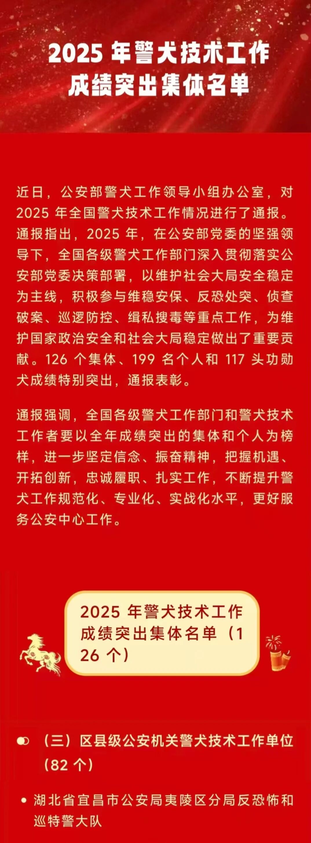 近日,公安部公布2025年全国警犬技术工作表彰名单,夷陵区公安分局反恐怖和巡特警大队荣获“2025年全国警犬技术工作成绩突出集体”称号。这份国家级荣誉,不仅是对全体训导员辛勤付出的最高肯定,更是对冲锋在前的“无言战友”的褒奖。